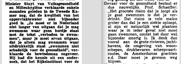 Ik moest er indertijd hard om lachen, zoals wel vaker om de gitzwarte humor in zijn liedjes. Zwemmen in de Amsterdamse grachten, het idee was te bespottelijk voor woorden. De grachten waren zo vies dat je er letterlijk doodziek van zou worden.