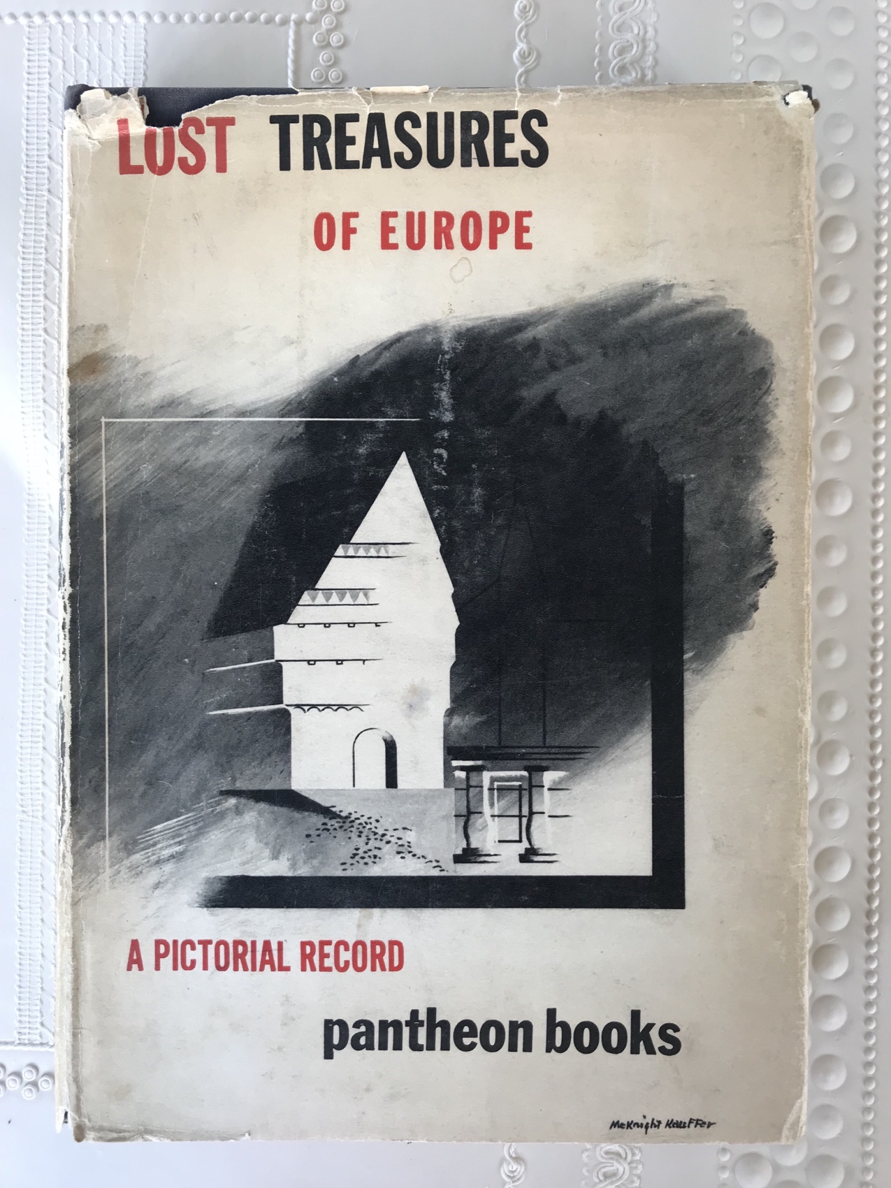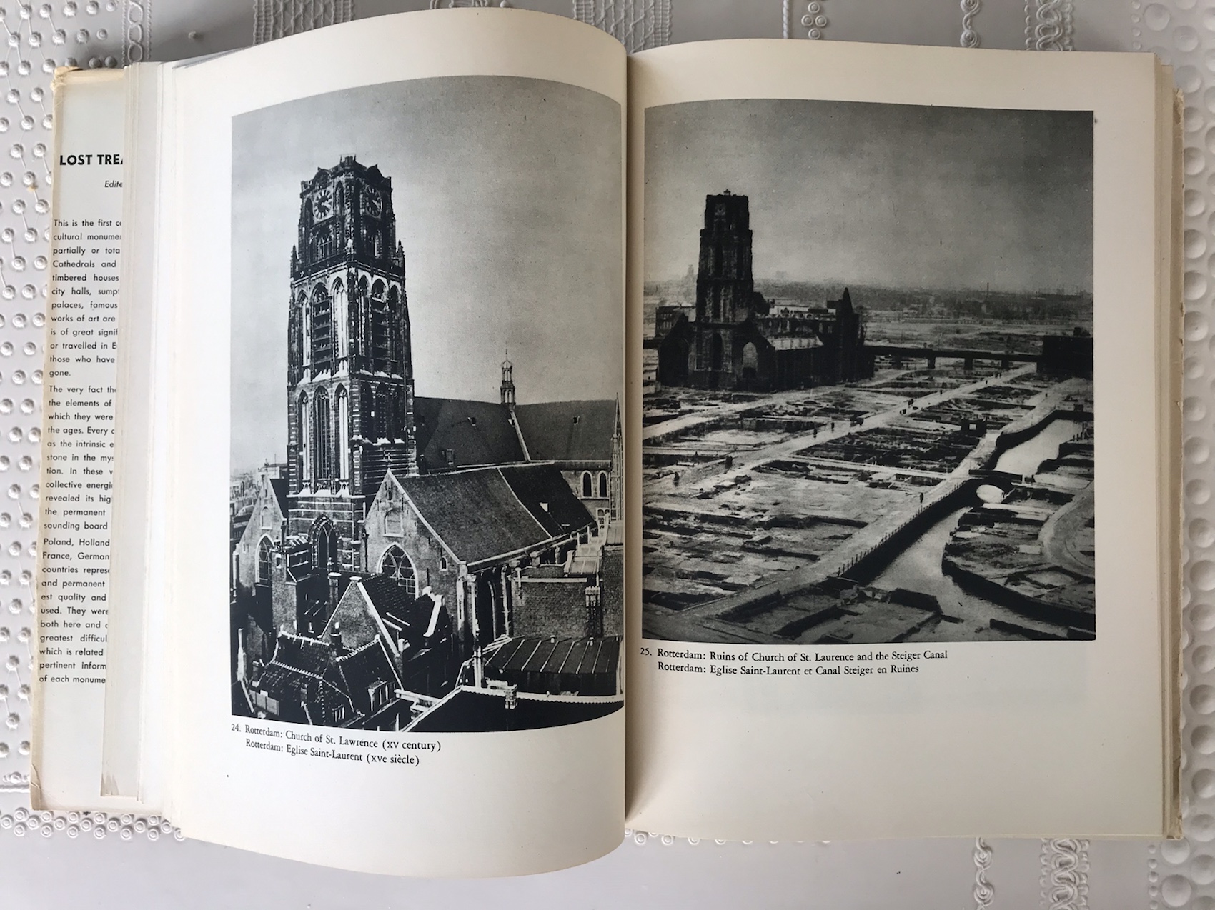 Een paar maanden geleden prees iemand op Twitter een oud boek aan dat tot de meest gekoesterde exemplaren uit zijn boekenkast hoorde. Lost Treasures of Europe, een fotoboek uit 1946 met 427 foto’s van gebouwen en kunstschatten die in de Tweede Wereldoorlog verwoest zijn. Ik aarzelde geen moment en bestelde via een antiquariaatsite een exemplaar dat een paar dagen later in de brievenbus lag. Toen was de impuls die tot de aankoop leidde alweer weggeëbd en ik legde het boek in de kast. Meer iets voor mei, de maand waarin we de verschrikkingen van de oorlog herdenken. Dus nu kwam het uit de kast.
