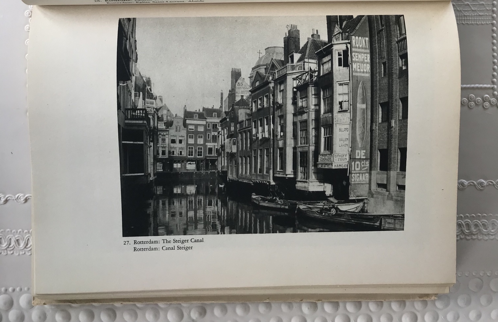In het boek staan wat foto’s van Rotterdam. De Laurenskerk natuurlijk, de Notre Dame van deze stad, om het zo maar te zeggen. Het enige gebouw in de stad dat stamt uit de Middeleeuwen. De bouw begon 570 jaar geleden, in 1449. Compleet verwoest.