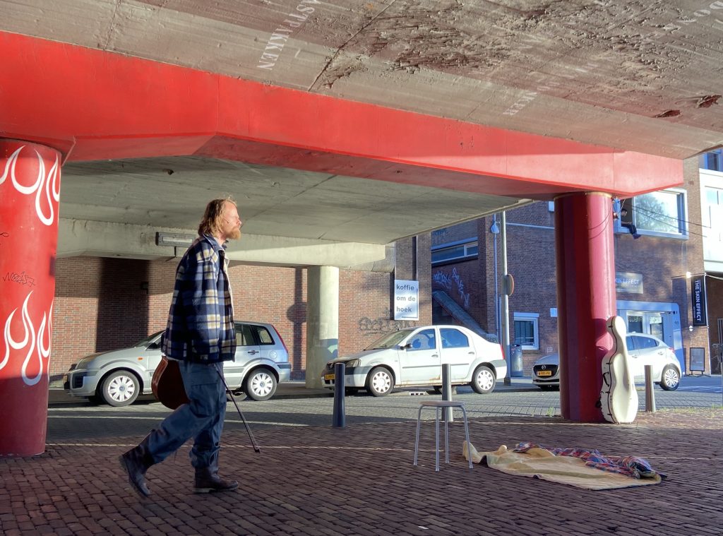 We kijken naar het tafereel onder de Pieter de Hoochbrug in Rotterdam-West. Even verderop is een nachtopvang voor daklozen van het Leger des Heils gevestigd. De dakloze muzikant heeft na omzwervingen door de straten in de laadbak van een pick up truck geslapen, vertelt hij. De nacht was koud en vochtig. All you need is cash.