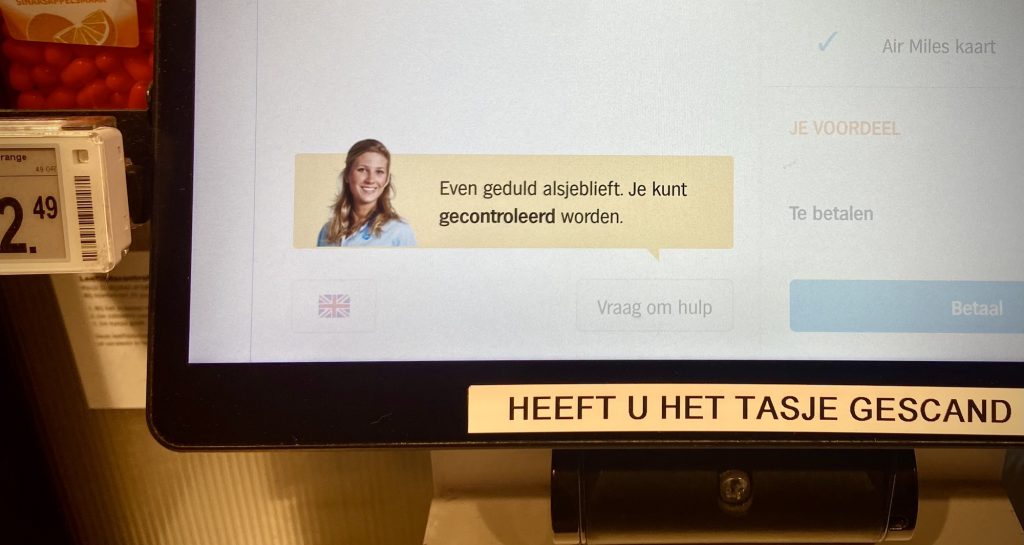 Ik moet bekennen dat ik dat op zich al erg irritant vind. Het idee van een zelfscankassa is immers dat je niet hoeft te wachten. Anders kun je net zo goed in de rij gaan staan bij de gewone kassa. Soms verschijnt er na de mededeling over de controle niemand, kun je na wat ongemakkelijk talmen gewoon afrekenen en heb je voor niks staan wachten maar meestal arriveert een medewerker die zich excuseert en vervolgens de artikelen uit je zorgvuldig ingeruimde boodschappentas begint te halen om ze te controleren. Toch een beetje alsof iemand met modderlaarzen binnenstapt als je net de stofzuiger opbergt.